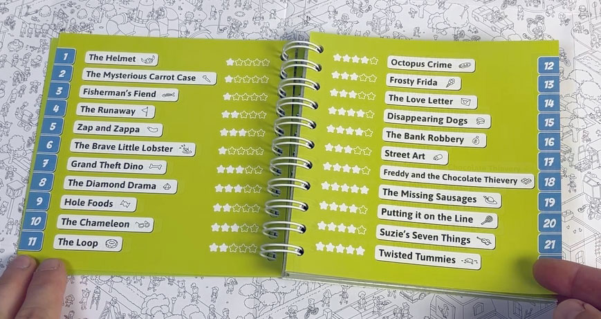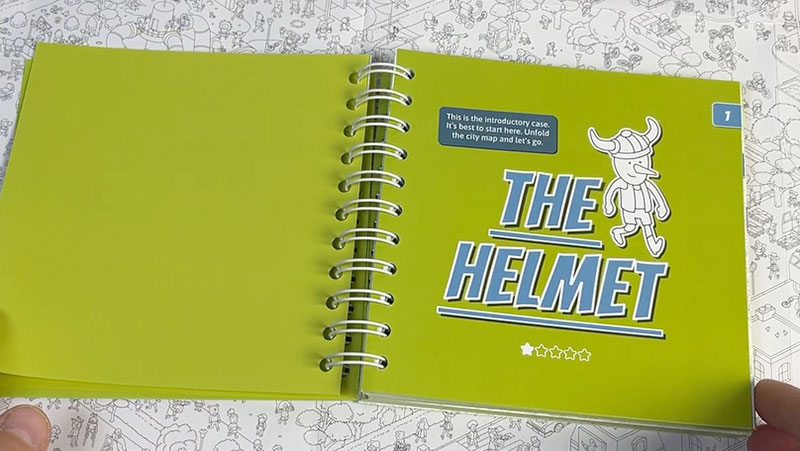 There’s a series of 22 cases in Crazy City Park. Open up the spiral-bound book to the case you’re going to work on – the first case is called “The Helmet”. You’ll notice both in the table of contents and before every case, there will be an image exemplifying the theme of the case, and a difficulty rating between 1-5 stars.